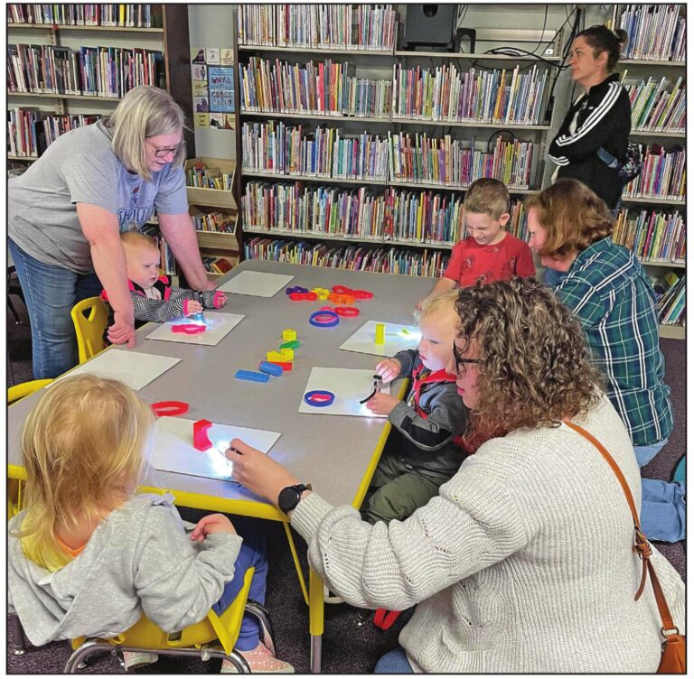 Parents Carla Youngblood, Amy Wilson and Marcie Ellis along with program facilitator Jennifer Geeo create shadows with toy dinosaurs as they wonder, notice and tell more about what they have discovered. Pictured are Youngblood (far left) and great-granddaughter Charley, 19 months; Wilson, kneeling, shown assisting her two kids with the activity, and Geeo demonstrating to Titus Joe Ellis how moving the flashlight can create different shadow patterns, while Elllis looks on. Submitted photo