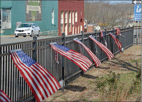 American flags placed by the Berryville Lions Club line the fence of the Berryville Public Square on Monday, Feb. 20, in observance of Presidents Day. David Bell / Carroll County News