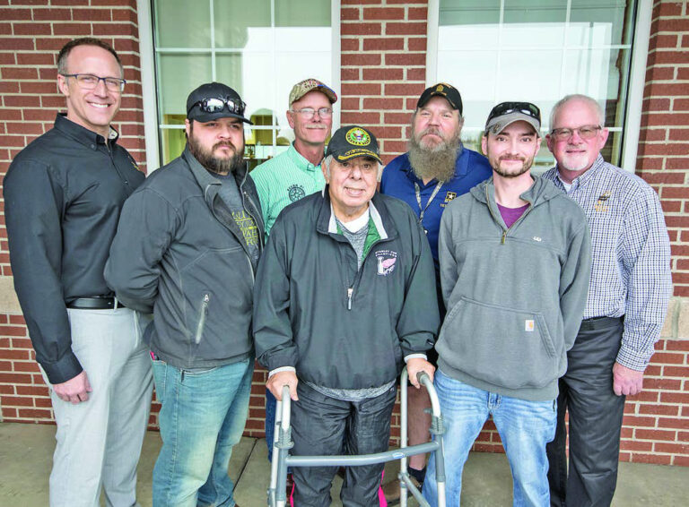 Equity Bank in Berryville recently held an awards ceremony thanking Carroll County military veterans for their service. Pictured from left to right are Justin Harris, regional president for Equity Bank; U.S. Marine Corps veteran Robert Fairweather of Oak Grove; Vince Eastwood, president of the veterans support organization RECON-VI; U.S. Army veteran Jose Galindo of Holiday Island; John Contreras of the Carroll County Veterans Service Office; U.S. Army veteran Eric Griesenauer of Berryville; and Craig Kesner, Berryville market president for Equity Bank. (David Bell / Carroll County News)