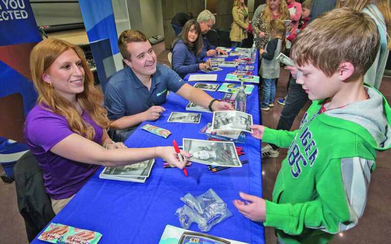 Alyssa Kelly (left) and Michael Gibson of KY3 give autographed photos to Jaxson Ryker of Berryville during the Springfield television station’s visit to Berryville on Thursday, March 9. (David Bell / Carroll County News)