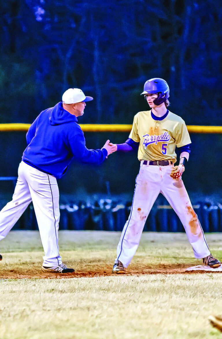 Berryville coach Shawn Caldwell greets senior Aspen Linz at third base in a game earlier this season. Linz drove in two runs and scored twice in a 7-6 loss to Greenland on Friday, April 21, at the Berryville Sports Complex. Greenland rallied from a 6-2 deficit after four innings. (Charles Chappell / CCImages.PhotoShelter.com)