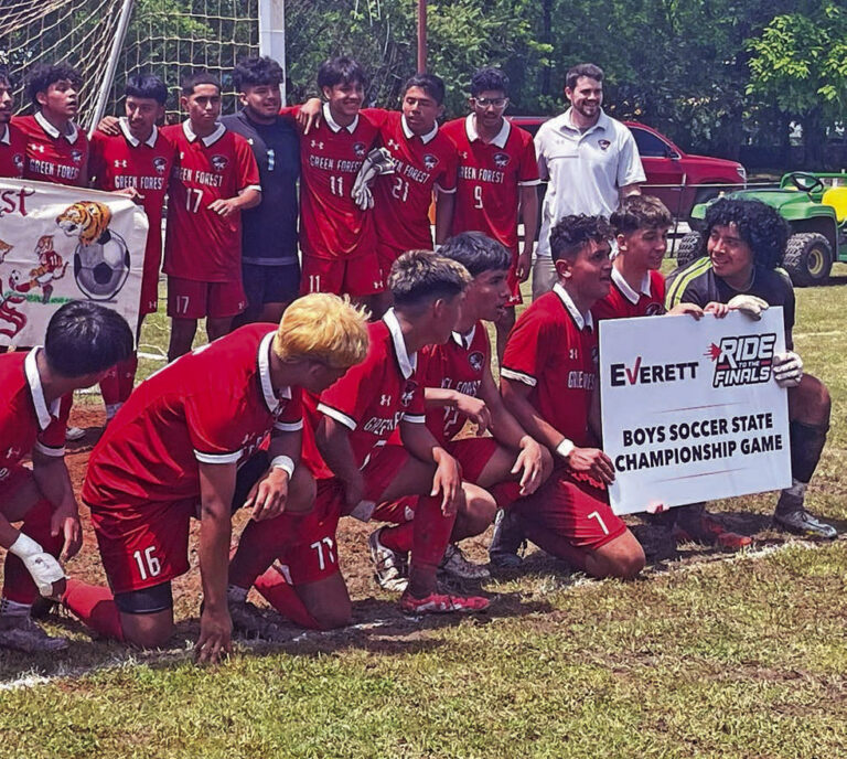 The Green Forest Tigers celebrate after beating Central Arkansas Christian 4-1 in the semifinals of the Class 3A boys state soccer tournament on Saturday, May…