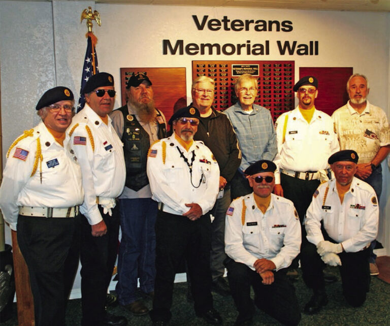 Local veterans stand in front of a new Veterans Memorial Wall dedicated Friday, May 26, at Smith Family Funeral Home in Green Forest. (Steve Johnson…