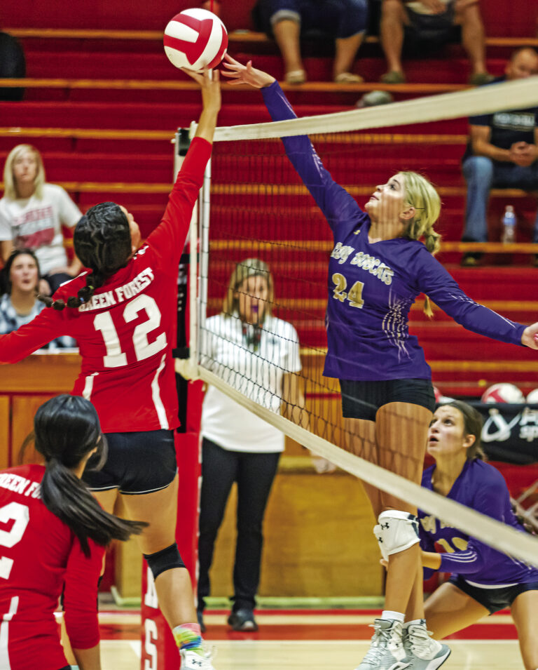 Green Forest’s Tamika Ramirez (12) and Berryville’s Kynadee Hopper (24) face off at the net as the Lady Tigers host the Lady Bobcats on Monday,…