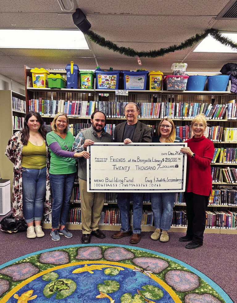 Guy Lessenberry presents a ceremonial check to the Friends of the Berryville Library to go toward the Berryville Library Building project. Pictured from left to are library staff member Anna Morris, Friends vice president Elaine Floyd, library board member and fundraising chair Tyler Squires, Lessenberry, library staff member Mary Esther Bizzell and Friends treasurer Karen Johnson. Submitted photo