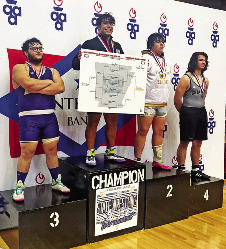 David Moreno (left) of Berryville High School won third place in the 285-pound weight class at the Arkansas State Wrestling Championships that concluded Saturday, Feb.…