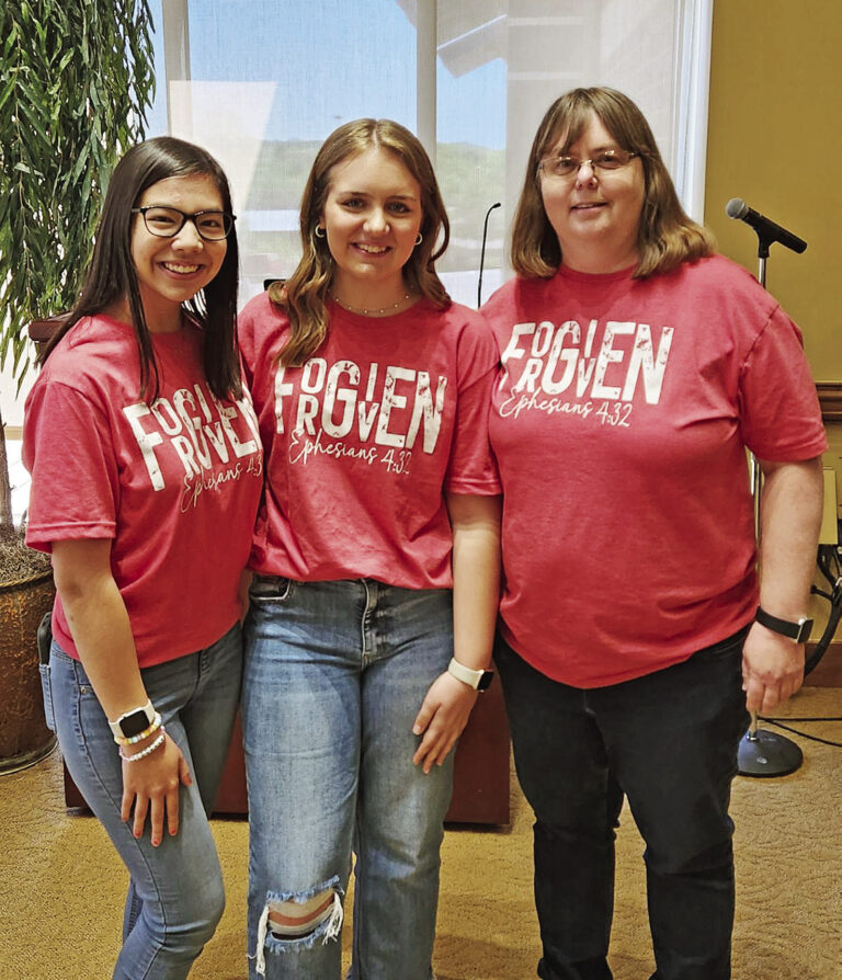 Faith McKinney (left) and Aubrey Lee (center) pose with Janie Curtis, Bible drill director at Grandview Baptist Church, during the Arkansas Baptist State Bible Drill…
