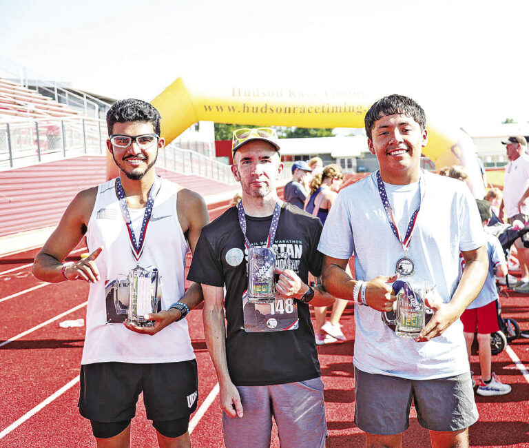 The top three male finishers from left to right were Arauny Reyes (first place, 17:51); Justin Gloor (second place, 19:47) and Erbin Mendoza (third place, 20:54). Submitted photo
