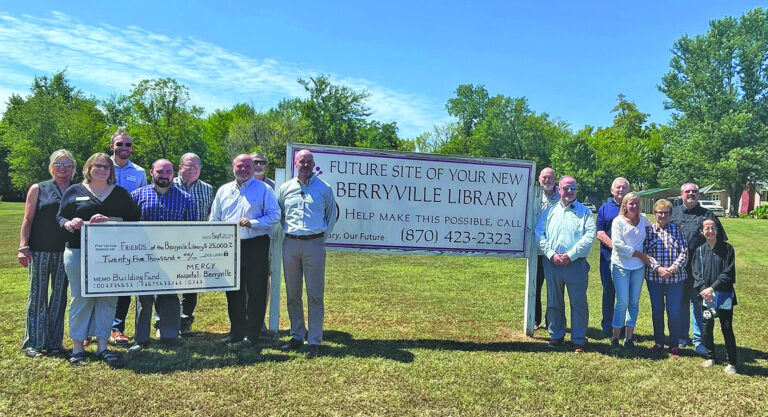 Supporters of the Berryville Library and representatives of Mercy Hospital Berryville celebrate the hospital’s donation of $25,000 toward a new library building on Wednesday, Sept. 4. Scott Loftis / Carroll County News