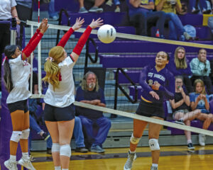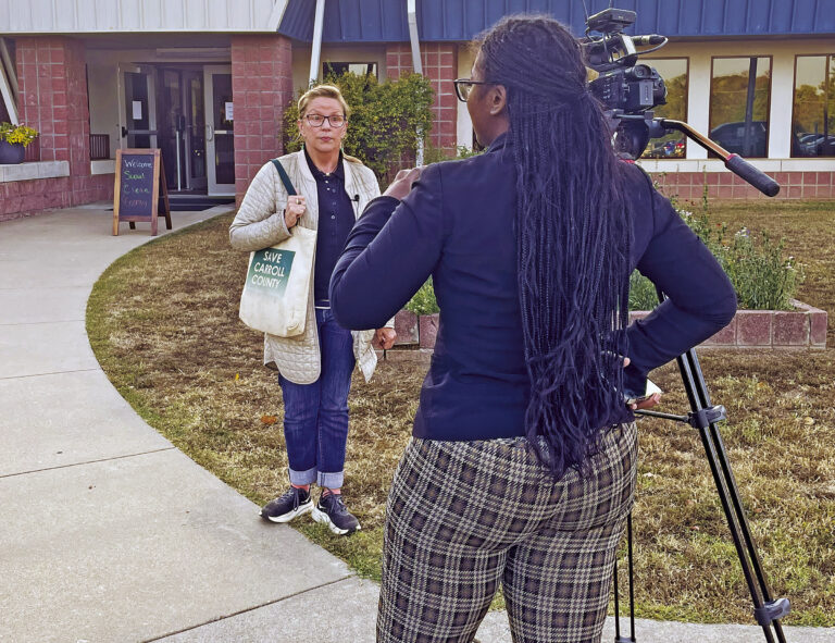 Angela Usrey of Concerned Citizens of the Ozarks (left) speaks to reporter Charmelle O’Dell of Springfield television station KY3 about her opposition to Scout Clean Energy’s Nimbus Wind Farm. Scout hosted an open house at the Berryville Community Center on Monday, Oct. 14, with a company official saying construction on the project is expected to begin in the next 30 to 60 days. Scott Loftis / Carroll County News