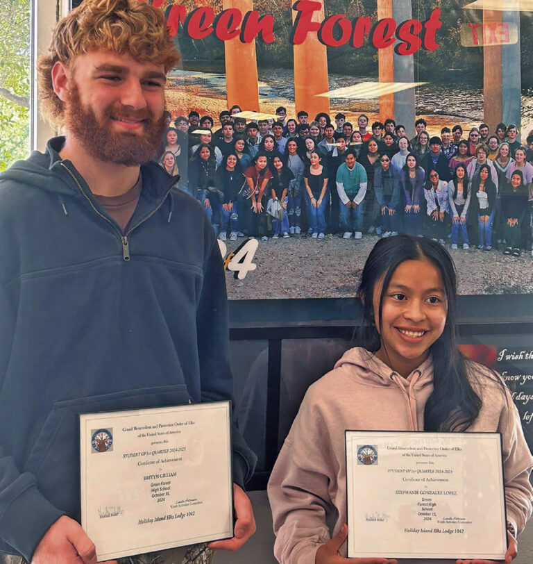 Holiday Island Elks Lodge 1042 presented certificates to Brityn Gilliam (left) and Stephanie Gonzalez Lopez for being selected as the students of the first quarter. Photo courtesy of Green Forest School District