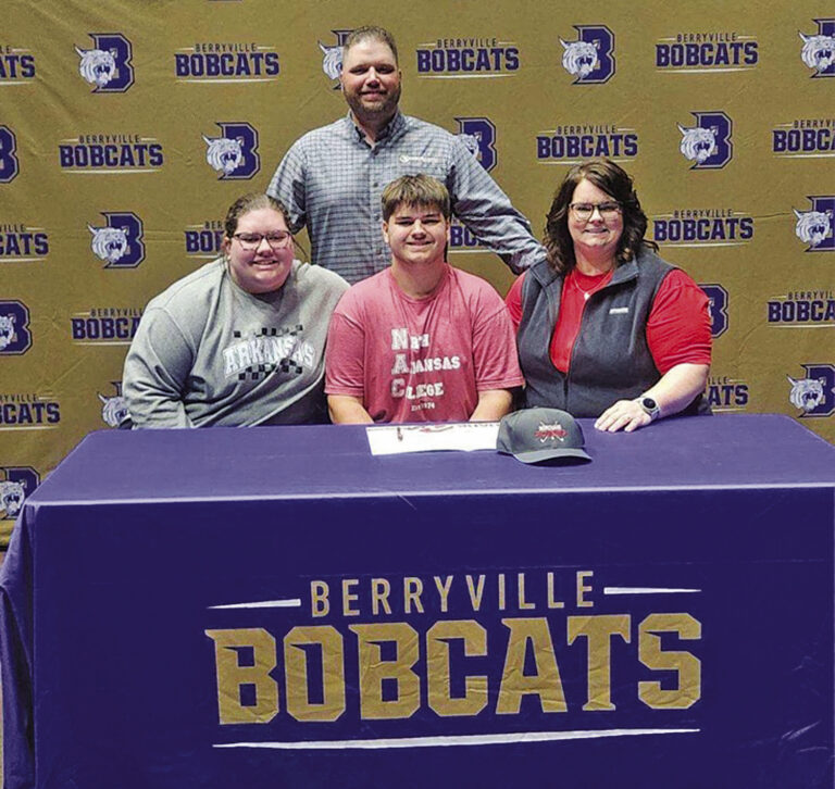 Berryville High School senior Titus Gregory (center) signed a letter of intent Monday, Nov. 18, to play golf at North Arkansas College. Pictured from left to right are sister Emily Felton, dad Travis Gregory, Titus Gregory and mom Misty Gregory. Photo courtesy of Brent Compton
