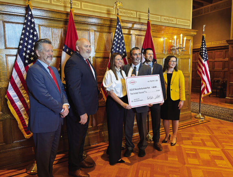 The City of Berryville was awarded a $400,000 grant from the Arkansas Economic Development Commission on Wednesday, Dec. 11, at the State Capitol in Little Rock. Pictured from left to right are Arkansas Secretary of Commerce Hugh McDonald, Berryville economic development director Dean Lee, Gov. Sarah Huckabee Sanders, Berryville Mayor Tim McKinney; AEDC executive director Clint O’Neal and AEDC director of business development Olivia Womack. Photo courtesy of Arkansas Economic Development Commission