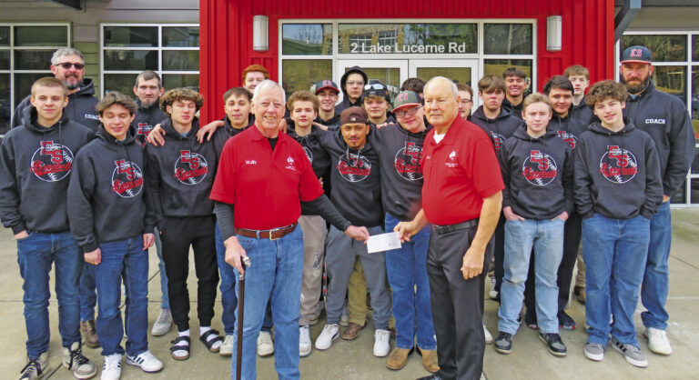 On Wednesday, Jan. 22, Elks Lodge No. 1042 treasurer Wally Kratzer (left) and secretary Al Selleck (right) presented a check for $4,000 to the Eureka Springs High School baseball team. The funds will be used for work on the Lake Leatherwood baseball fields and equipment for players. Submitted photo