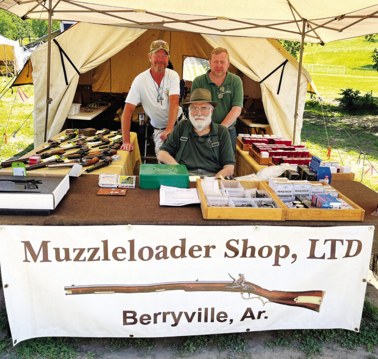 From left to right, Sean McCanless, Dykes Reber and Marty Paine of the Muzzleloader Shop in Berryville pose for a photo at the Arkansas State Championship Muzzleloader Shoot, held Thursday, May 15, through Sunday, May 18, at thr Luther Owens Shooting Range in Berryville. Scott Loftis / Carroll County News