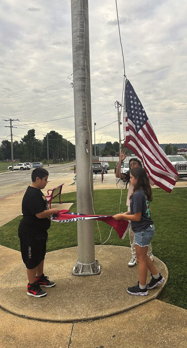 Green Forest’s new flag attendants raise the banner on Patriots Day, Thursday, Sept. 11. Officer Jacob Bradley of the Green Forest Police Department provided guidance and assistance to the students. Photo courtesy of Green Forest School Distirct