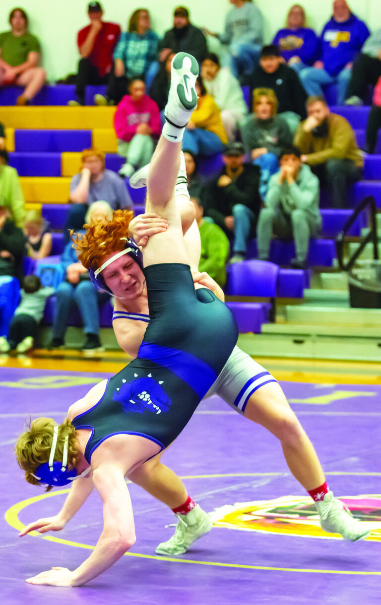 Berryville wrestler Ocean Mullins, a senior who is a team captain for the Bobcats, flips a Fayetteville wrestler during a match last week. Mullins earned All-State honors last season for the Bobcats and is expected to contend for a state championship this season. Charles Chappell / Carroll County News