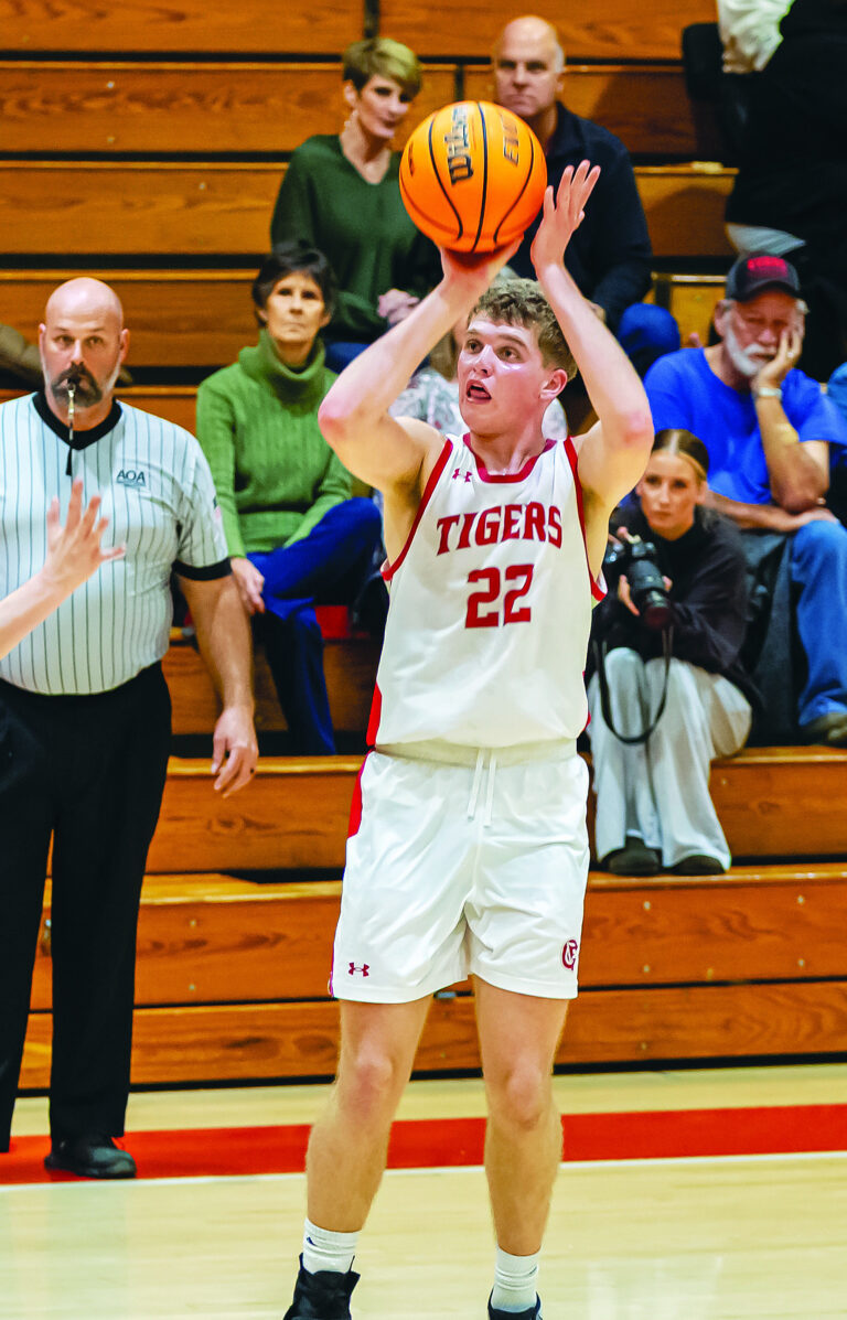 Green Forest junior Grady Massengale shoots a jump shot in a game earlier this season. The Tigers recorded their first-ever 4A-1 conference victory on Friday, Dec. 19, defeating Gentry 57-- 39 at the Grim Gym. Earlier in the week, the Tigers lost 60-46 at Huntsville. Green Forest’s girls lost to Huntsville 59-52 and to Gentry 61-- 35. Both teams will play in the CS Bank Holiday Hoops tournament beginning Monday, Dec. 29, at Berryville’s Bobcat Arena. Charles Chappell / Carroll County News