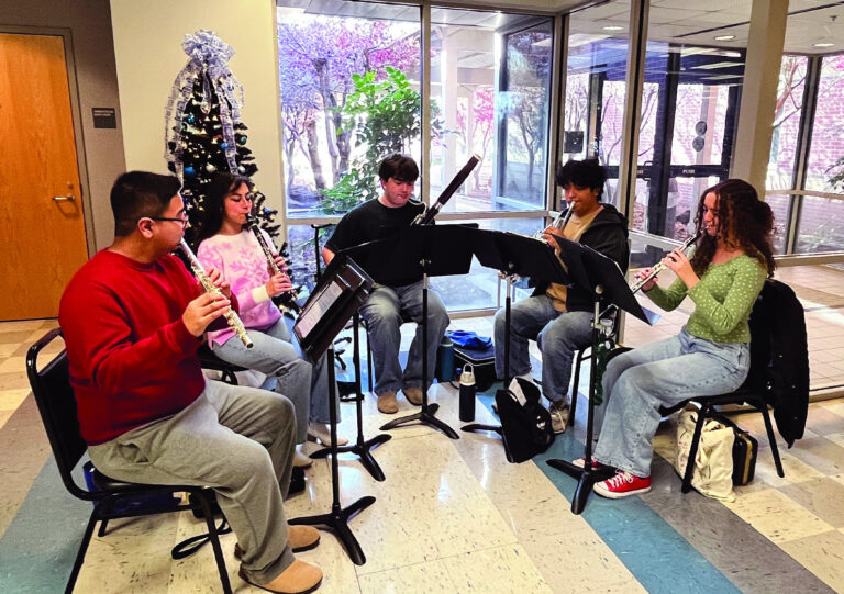 Berryville High School band students play holiday music in the lobby of Mercy hospital in Berryville on Wednesday, Dec. 17. Pictured from left to right are Israel Merida-Noriega on flute, Keily Diaz on clarinet, Karson Casey on bassoon, Maynor Cruz on French horn and Molly Staats on oboe. Scott Loftis / Carroll County News