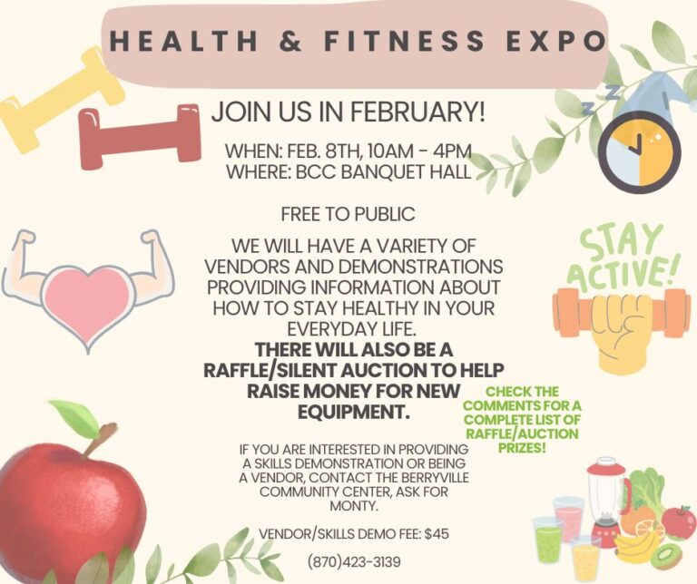 The Berryville Community Center will hold a Health & Fitness Expo from 10 a.m. to 4 p.m. Saturday, Feb. 8, in the community center banquet hall. The event will feature a variety of vendors and demonstrations providing information about how to stay healthy in your everyday life. There will also be a raffle/silent auction to help raise money for new equipment.
